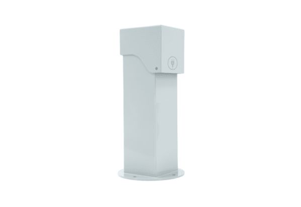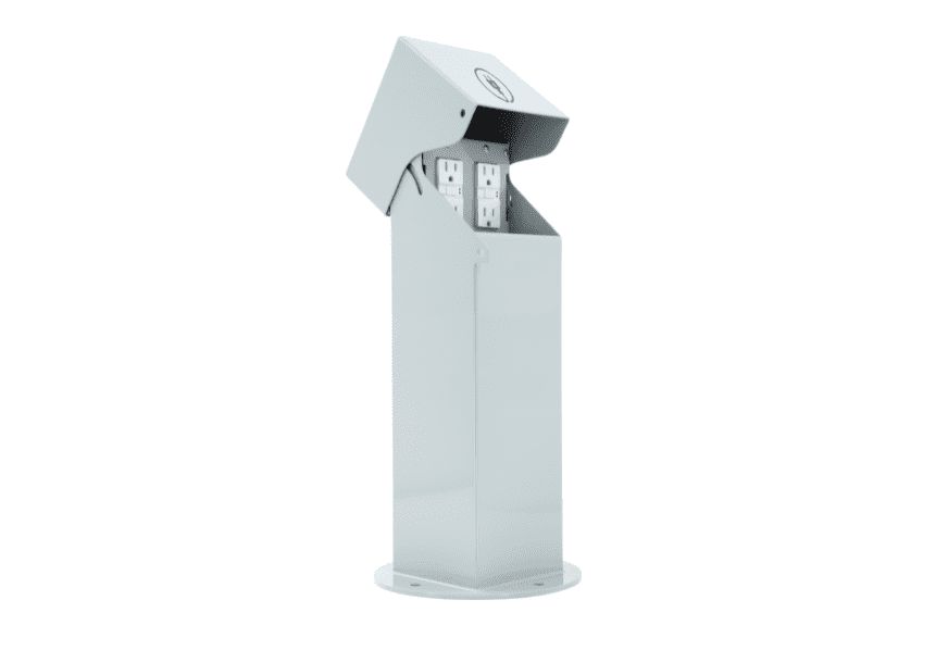A durable, outdoor-rated stainless steel power pedestal designed for secure and weatherproof power access. Featuring a lockable hinged lid, NEMA 3R rating, and self-closing in-use cover, it protects outlets from tampering and harsh elements. Available in multiple heights, several 15–60 Amp device mounting options, and a variety of finishes — including custom colors and additional device openings for specialized installations.